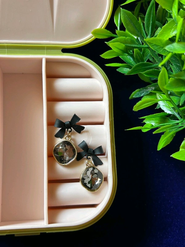 The Dreamy Noir Bow Drop Earrings feature a delicate black bow paired with a faceted smoky crystal drop, framed in a soft gold finish. Subtle shine, dramatic charm—this piece is made for girls who love understated luxury with a bold edge.