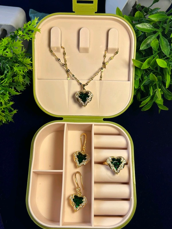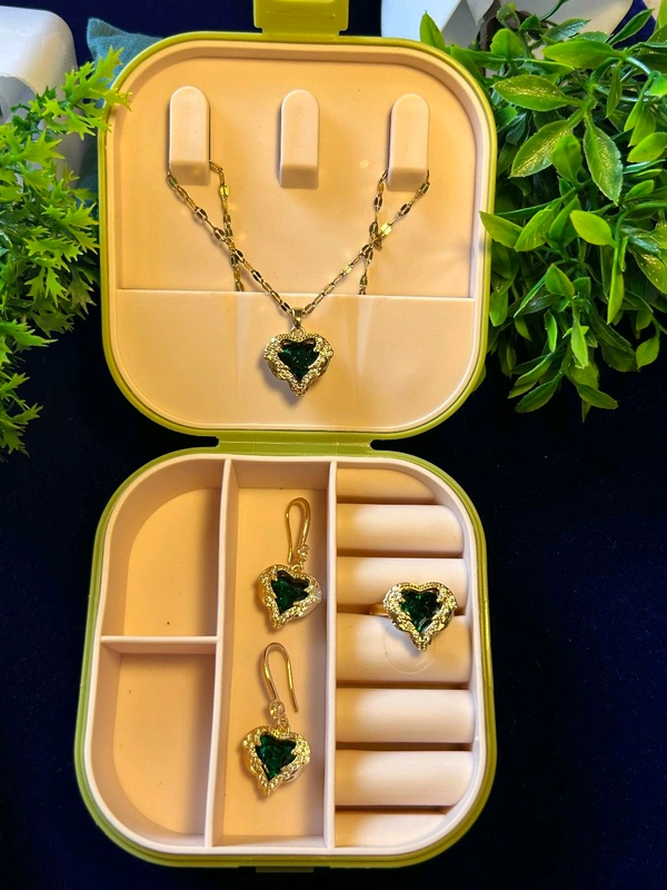 Radiant and regal, this set is the perfect statement for your most special occasions. It features a deep forest-green, heart-shaped crystal centerpiece cradled in a textured gold-tone halo. The set includes a delicate link-chain necklace, a matching cocktail ring, and elegant drop earrings. Designed for the dreamer who loves high-contrast glamour, this suite adds an undeniable touch of royalty to any evening look.